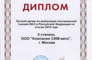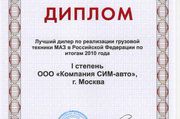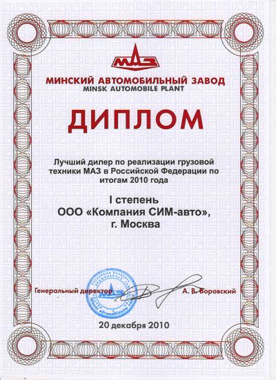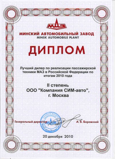 В торжественной обстановке генеральный директор ОАО «МАЗ» Боровский Александр Васильевич вручил представителю компании Русбизнесавто дипломы первой степени по реализации грузовой техники и второй степени по реализации пассажирской техники в 2010 году, как подтверждение плодотворной деятельности компании. По итогам 2010 года компанией Русбизнесавто было реализовано более 925 единиц грузовой и 18 единиц пассажирской техники.