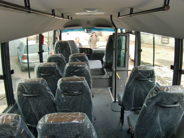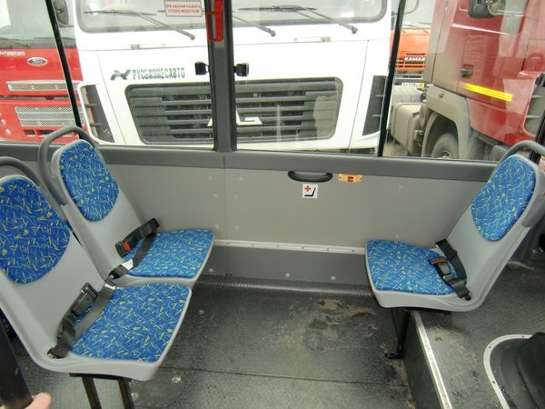 В городской версии из пятнадцати мест в салоне три сиденья развернуты задом на перед, а остальные по ходу движения. Все места, в соответствии с новыми тенденциями оснащены ремнями безопасности. Накопительная площадка не предусмотрена, но при указанной пассажировместимости она и не нужна - места для тех, кто едет стоя предостаточно. Зато поручней в салоне с явным запасом – кроме тех, что на сиденьях, есть и пара потолочных. В целом, для салона больше всего подходит термин «просто и функционально».