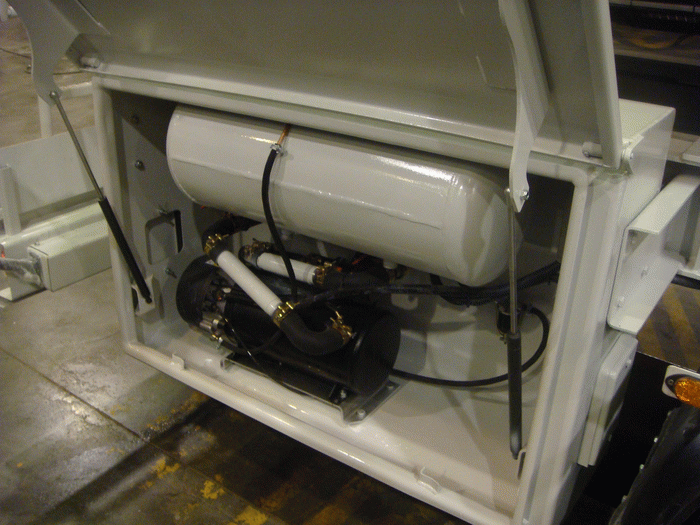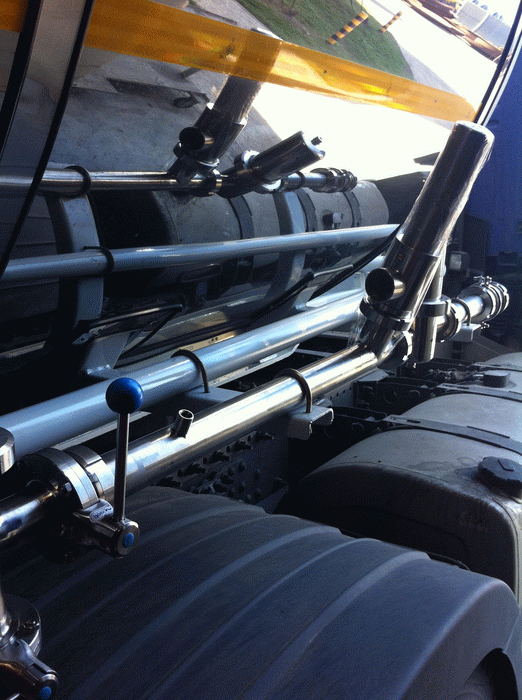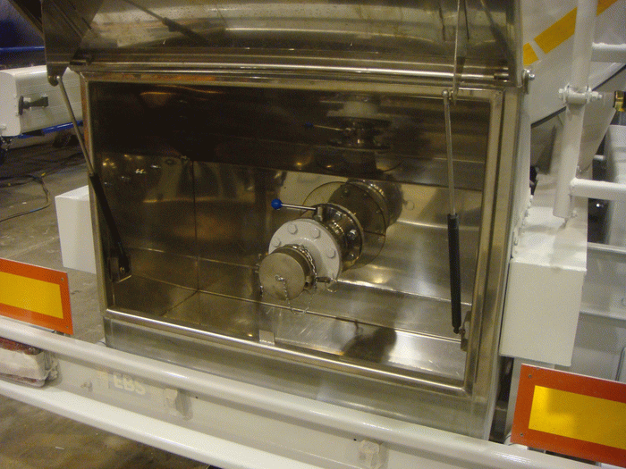 Разгрузка цистерны осуществляется самотеком через сливной люк в задней части конструкции – раздельно из каждого отсека в общий коллектор, без измерительных приборов. Для выгрузки применяется двойная затворная арматура, донный клапан и дисковый затвор диаметром 100 мм. Данная форма позволяет слить весь продукт без остатка и в дальнейшем легко промыть цистерну. Оборудование для разгрузки расположено в закрываемом технологическом шкафу, выполненном из полированной нержавеющей стали для защиты от внешних условий. Технологический шкаф для удобства размещен также в задней части цистерны.