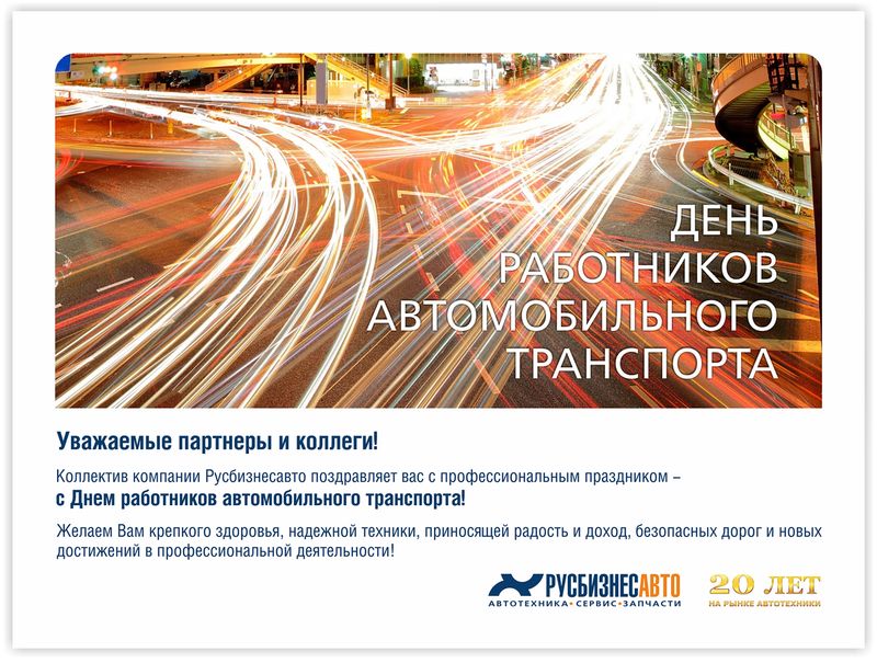 Уважаемые партнеры, коллеги! Коллектив компании Русбизнесавто поздравляет вас с профессиональным праздником - С Днем работников автомобильного транспорта!