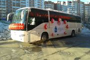 Туристский автобус Higer KLQ6129Q представляет собой 47-местную машину, предназначенную для вояжей на расстояния свыше 200 км. Как и положено автобусам такого класса, в салоне присутствуют все атрибуты, способствующие повышению комфорта пассажиров: кресла с регулируемой спинкой, индивидуальные блоки освещения и вентиляции, тонированные стекла и т.п. А большая степень остекления позволяет любоваться окрестностями. Кроме того, спортсмены, несомненно, оценят большие багажные отсеки с возможностью сквозной погрузки – громоздкие сумки всей команды не придется грузить в салон. При желании можно заказать себе модификацию с холодильником и кулером, туалетом или спальным местом для второго водителя.