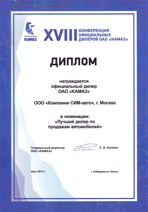 15 -19 марта 2014 года состоялась XVIII ежегодная конференция официальных дилеров ОАО "КАМАЗ". На конференции были приняты решения по основным направлениям совместной деятельности дилеров и производителя автотехники КАМАЗ, определены перспективы и задачи на 2014 год, а также подведены итоги работы дилерской и сервисной сетей КАМАЗ. ООО "Компания "СИМ-авто" (юридическое лицо компании Русбизнесавто), являясь ведущим дилером автомобильного завода ОАО "КАМАЗ", получила признание "Лучшего дилера по продаже автомобилей в 2013 году". Данную номинацию компания получает заслуженно уже пятый год подряд.