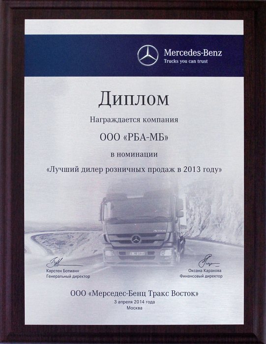 По итогам работы за 2013 год ООО "РБА-МБ", входящая в группу компаний "Копания СИМ-авто" - официальный бренд Русбизнесавто – было признано лучшим дилером в розничных продажах за 2013 год.