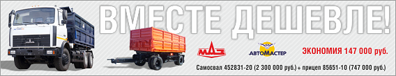 Приобретая в Русбизнесавто одновременно по специальной цене: 2 500 000 рублей cамосвал Автомастер 452831-20 и самосвальный прицеп Автомастер 85651-10 вы экономите 147 000 рублей. Спешите, срок действия предложения и количество техники ограничены.